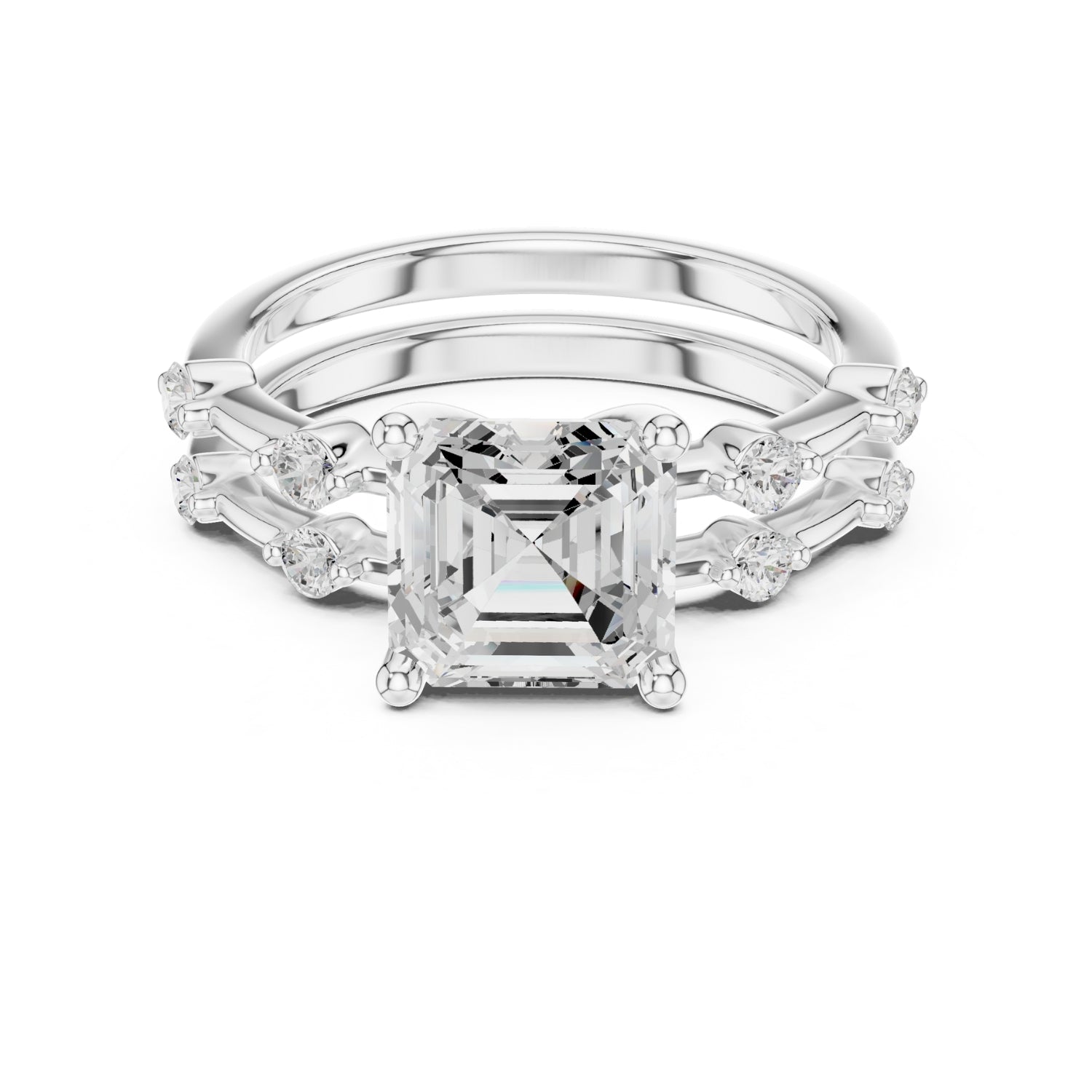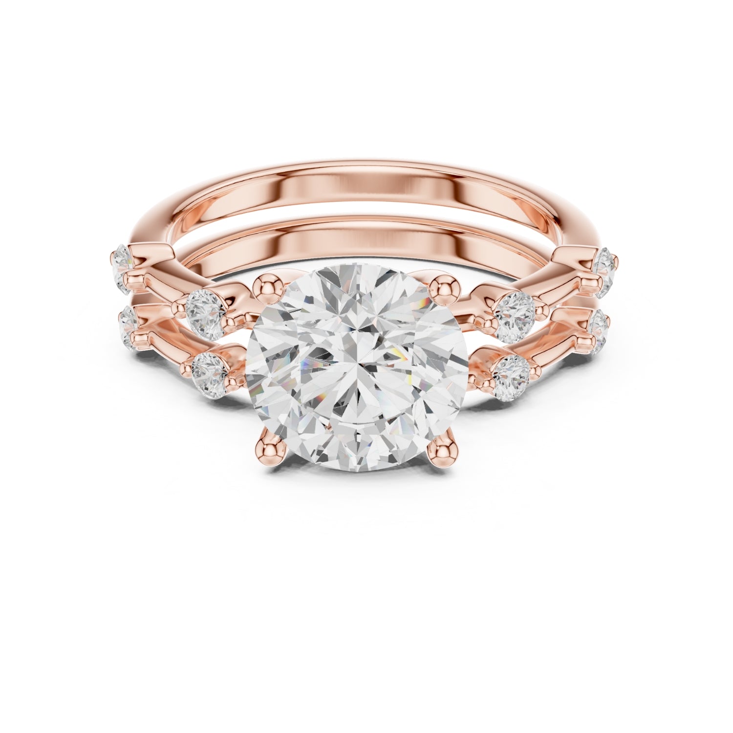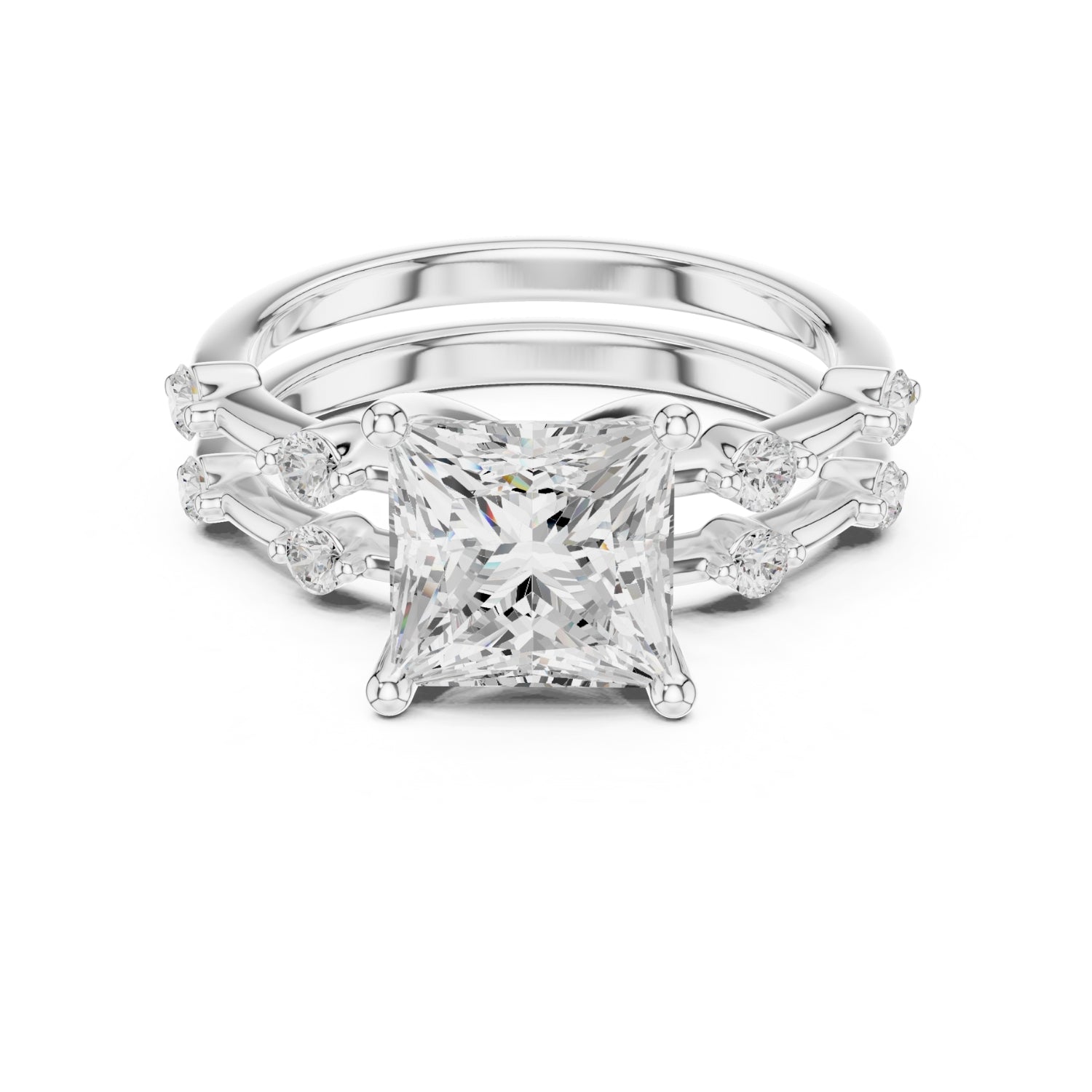 Celebrate your forever with this exquisite bridal set, designed to symbolize elegance and commitment. The centerpiece showcases a brilliant 2.50-carat diamond held securely in a classic four-prong setting, radiating unmatched sparkle. The matching band features delicately set side stones, adding extra brilliance and completing the luxurious look.