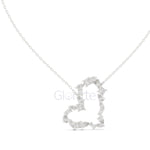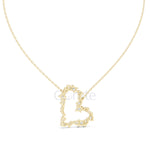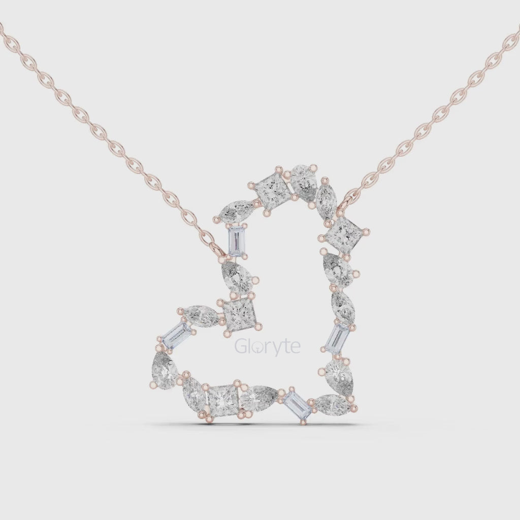 Romantic 14KT gold necklace featuring an open-heart design set with a mix of pear, marquise, baguette, and princess-cut diamonds. This sparkling pendant captures love and elegance, making it the perfect gift or timeless keepsake.