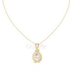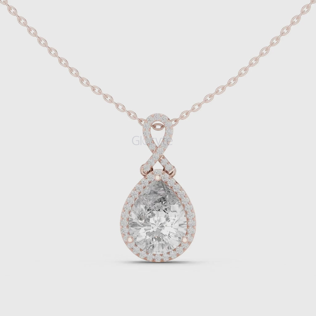 An exquisite pendant featuring a pear-cut center stone surrounded by a glittering halo of round diamonds, with an elegant infinity-style bale that symbolizes everlasting love. Crafted in 14KT gold, this necklace blends timeless design with meaningful detail, perfect for both daily wear and special occasions.