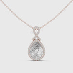 An exquisite pendant featuring a pear-cut center stone surrounded by a glittering halo of round diamonds, with an elegant infinity-style bale that symbolizes everlasting love. Crafted in 14KT gold, this necklace blends timeless design with...