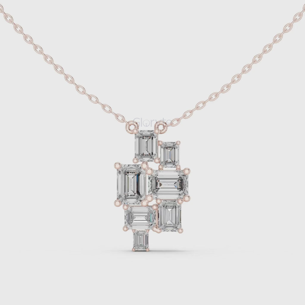 A bold and modern necklace featuring an emerald-cut diamond cluster in a geometric design. This pendant creates a striking statement with its structured layout of step-cut diamonds, offering brilliance with clean sophistication. Perfect for those...