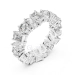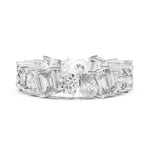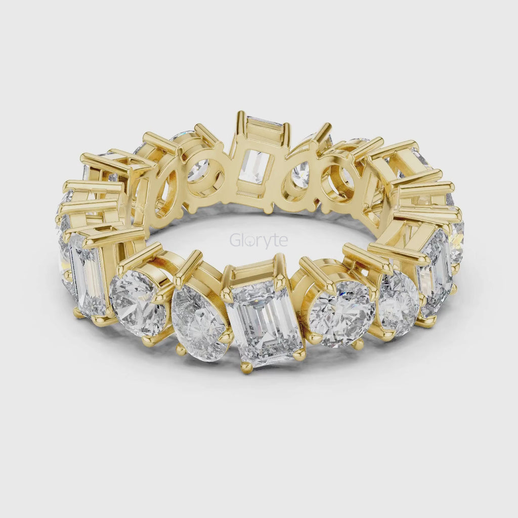 This unique eternity band combines pear, round, and emerald-cut diamonds in a bold alternating pattern. Set in secure collet settings, the mixed cuts create a striking balance of brilliance and elegance, making it an ideal statement piece for weddings or anniversaries.