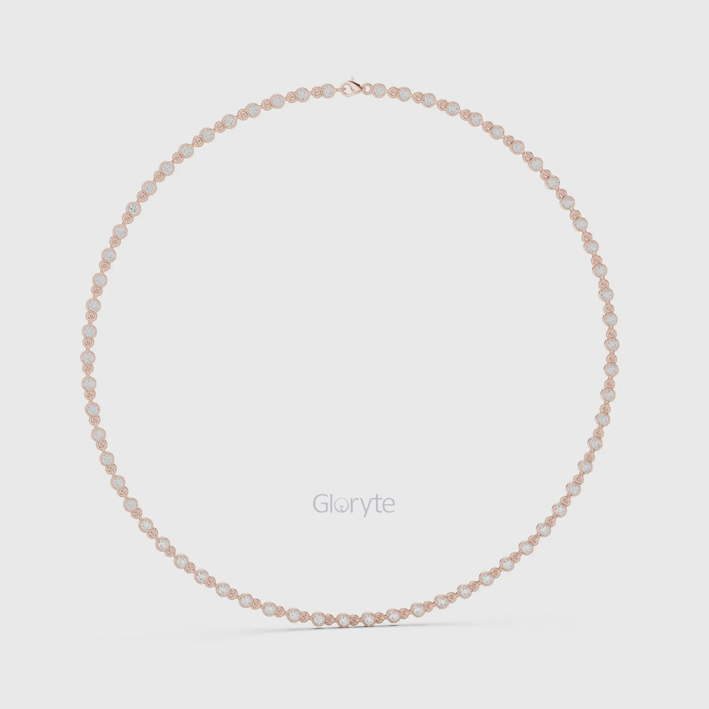 This timeless tennis necklace features 64 round brilliant-cut diamonds, each set in sleek bezel settings for a modern yet classic look. Designed to capture light from every angle, it’s an elegant staple that transitions seamlessly from day to evening wear. A luxurious piece that embodies both sophistication and versatility.