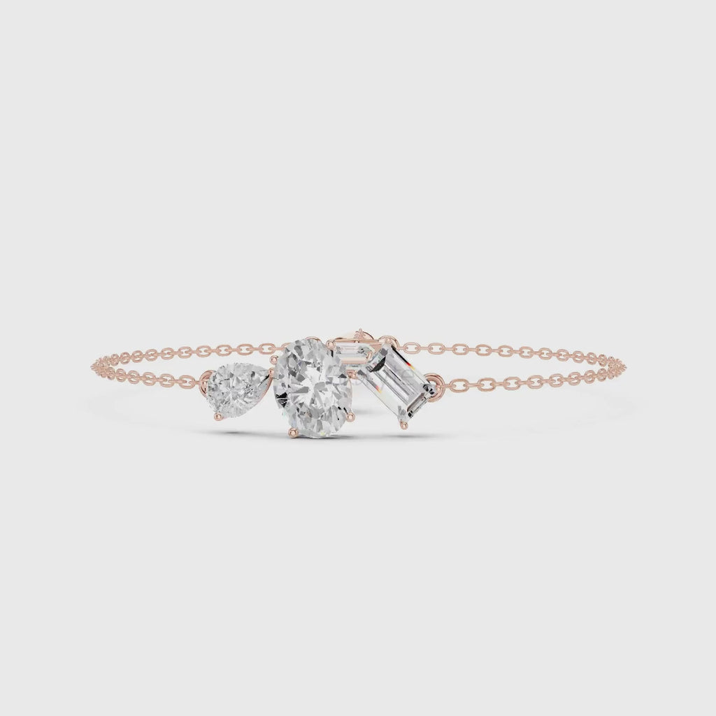 An elegant diamond bracelet featuring a mix of four classic cuts: oval, pear, baguette, and emerald. Each diamond is prong-set in a delicate gold chain, showcasing a refined, timeless look. A versatile piece that effortlessly...
