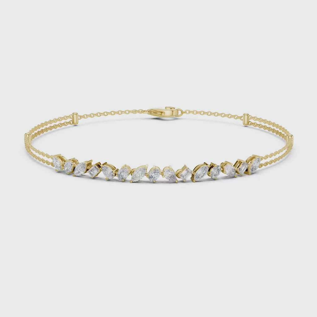 A modern take on elegance, this chain bracelet features 15 dazzling diamonds in pear, oval, marquise, and emerald cuts. Each stone is set in a sleek collet setting, creating a contemporary yet timeless design. The double chain adds refinement and ensures both durability and comfort for daily wear or special occasions.