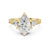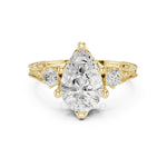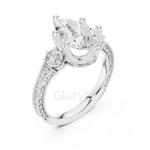 This vintage-inspired bridal ring features a stunning pear-cut diamond centerpiece, flanked by two brilliant round diamonds. The intricate engraved band adds a timeless elegance, making this design perfect for brides who appreciate both classic beauty and intricate craftsmanship.