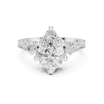 This vintage-inspired bridal ring features a stunning pear-cut diamond centerpiece, flanked by two brilliant round diamonds. The intricate engraved band adds a timeless elegance, making this design perfect for brides who appreciate both classic beauty...