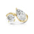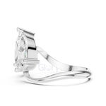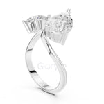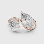 A modern bypass-style ring featuring a round brilliant-cut diamond and a pear-shaped diamond. Both stones are securely collet-set, creating a unique and elegant design that beautifully symbolizes balance and harmony. Perfect for engagements or as a statement jewelry piece.
